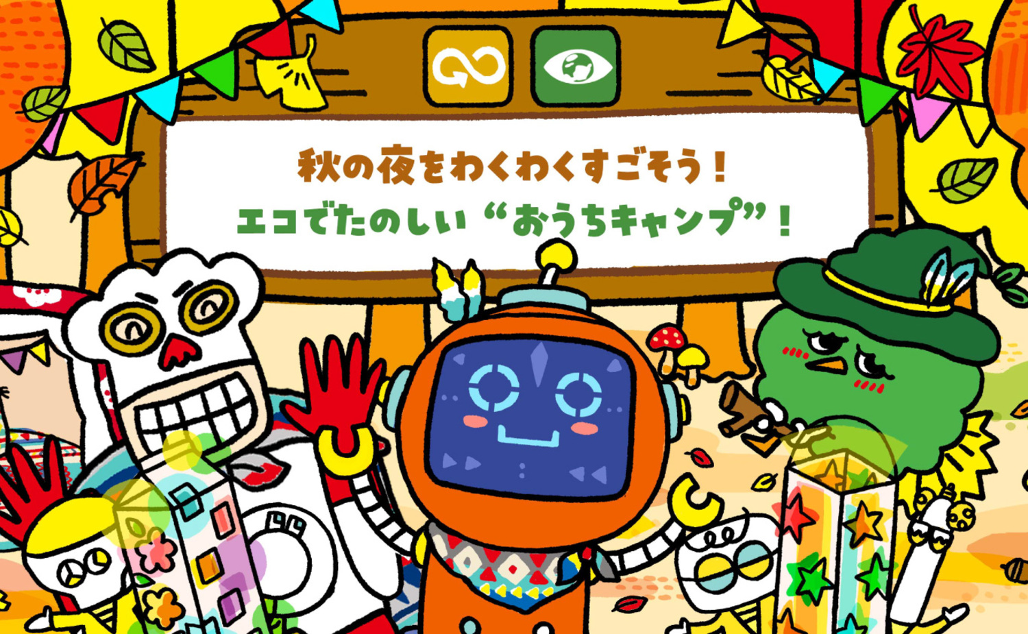 秋の風が気持ちいい ある日のこと。みらいたうんのなかまたちで、“おうちキャンプ”を することになりました。あまったしょくざいや、つかわなくなったテーブルなどを もちよって、さあ、おうちキャンプの はじまりです!