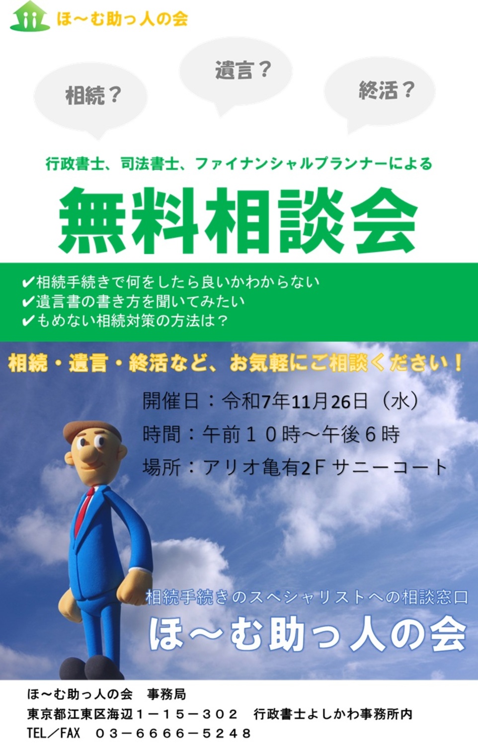 行政書士・司法書士・ファイナンシャルプランナーによる「遺言・相続無料相談会」