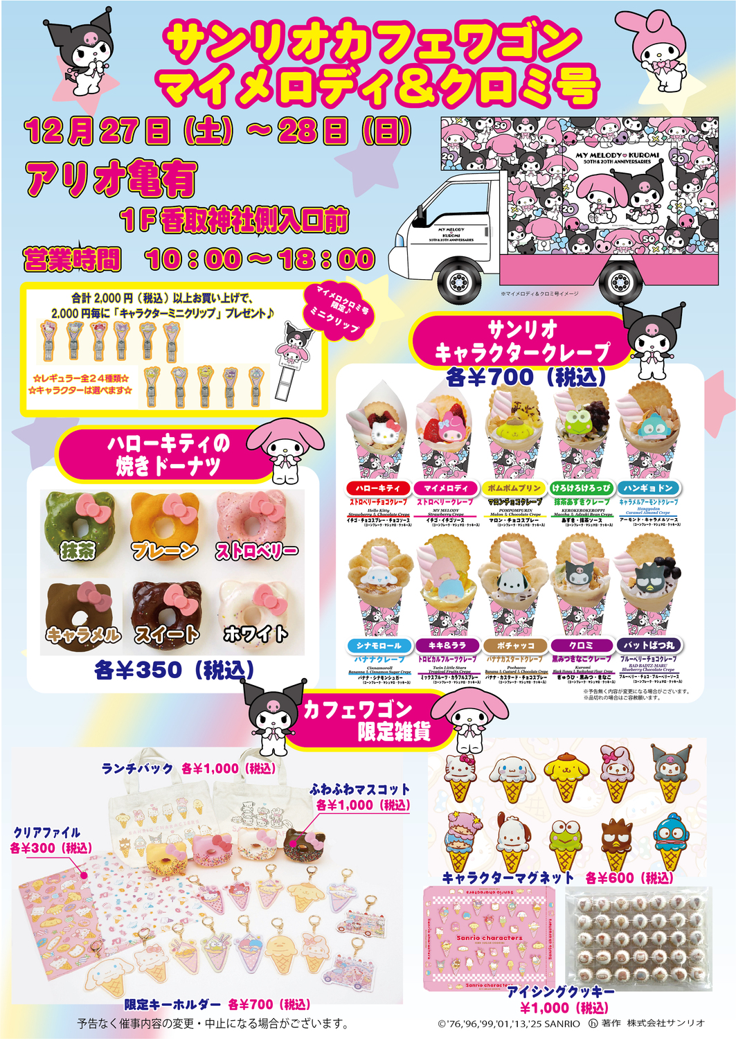 マイメロディとクロミがいっぱいのカワイイワゴンで、限定巻紙のキャラクタークレープや、カフェワゴン限定商品を提供します♪