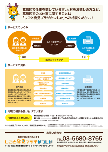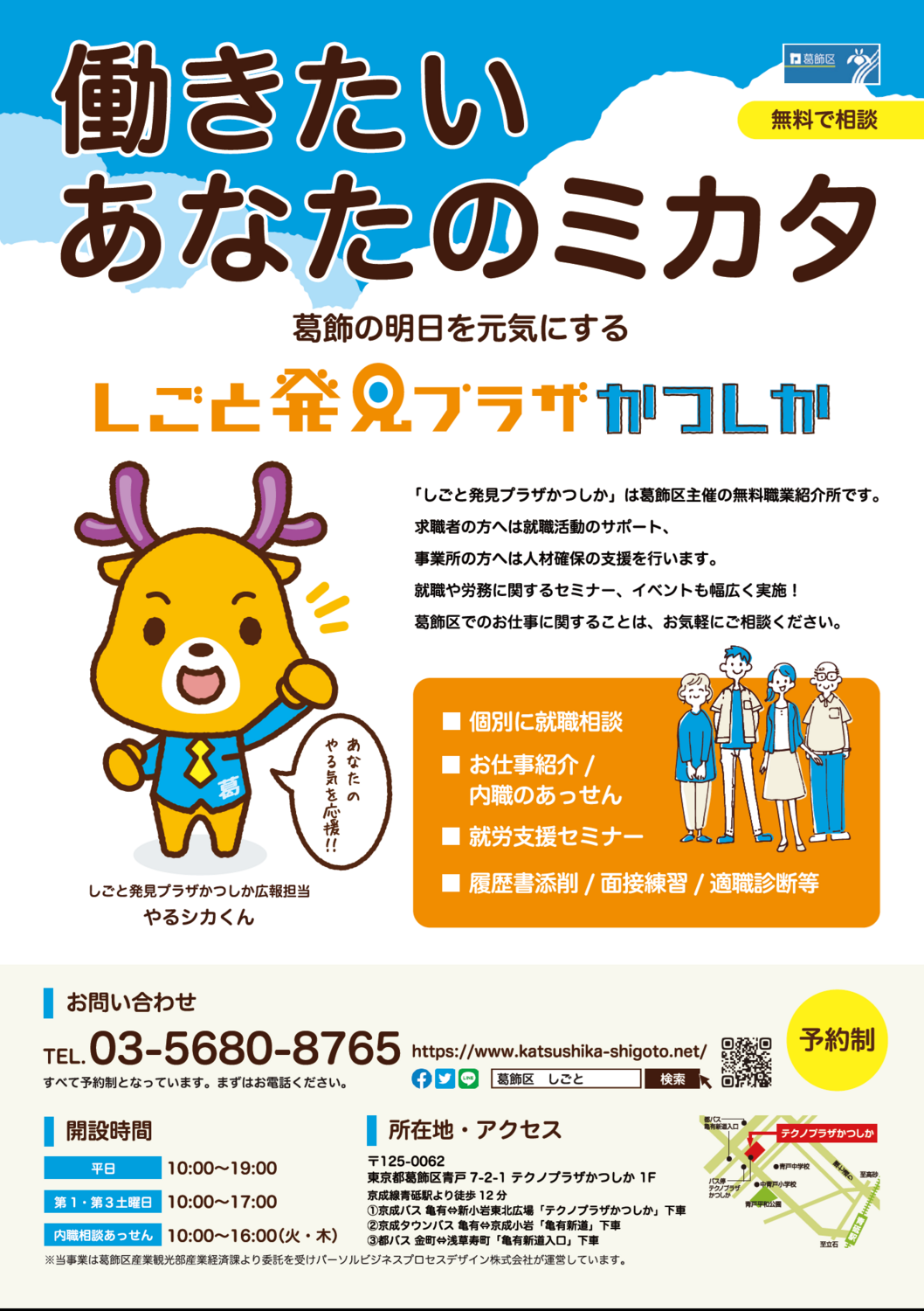 ○しごと発見プラザかつしかは葛飾区が運営する無料職業紹介所です。