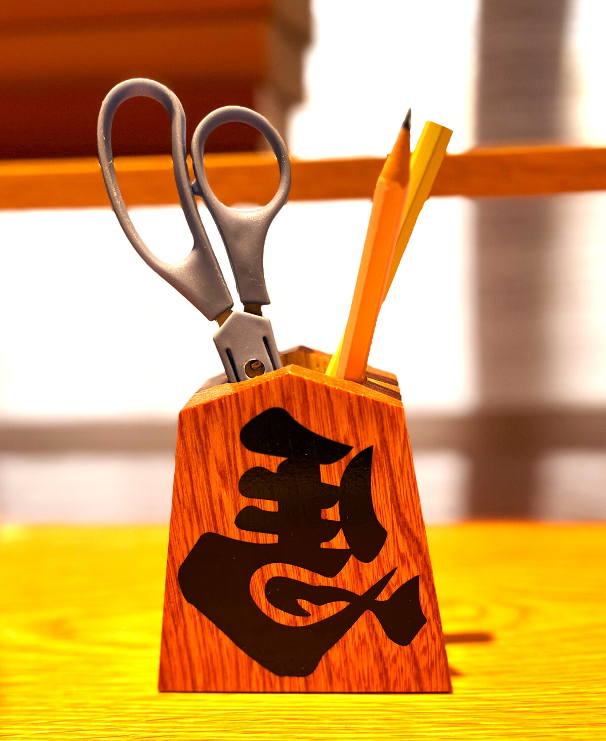 ペン立てとしても使える伝統的工芸品の「天童将棋駒」に、招福・開運・商売繁盛の象徴として親しまれる「左馬」の文字を筆で描き入れていただきます。