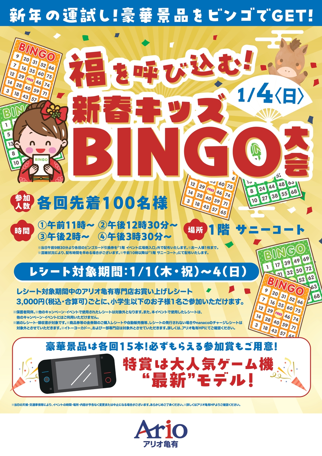 ※当日午前9時30分より各回のビンゴカード引換券を「1階 アリオイベント広場側入口」外で配布いたします。