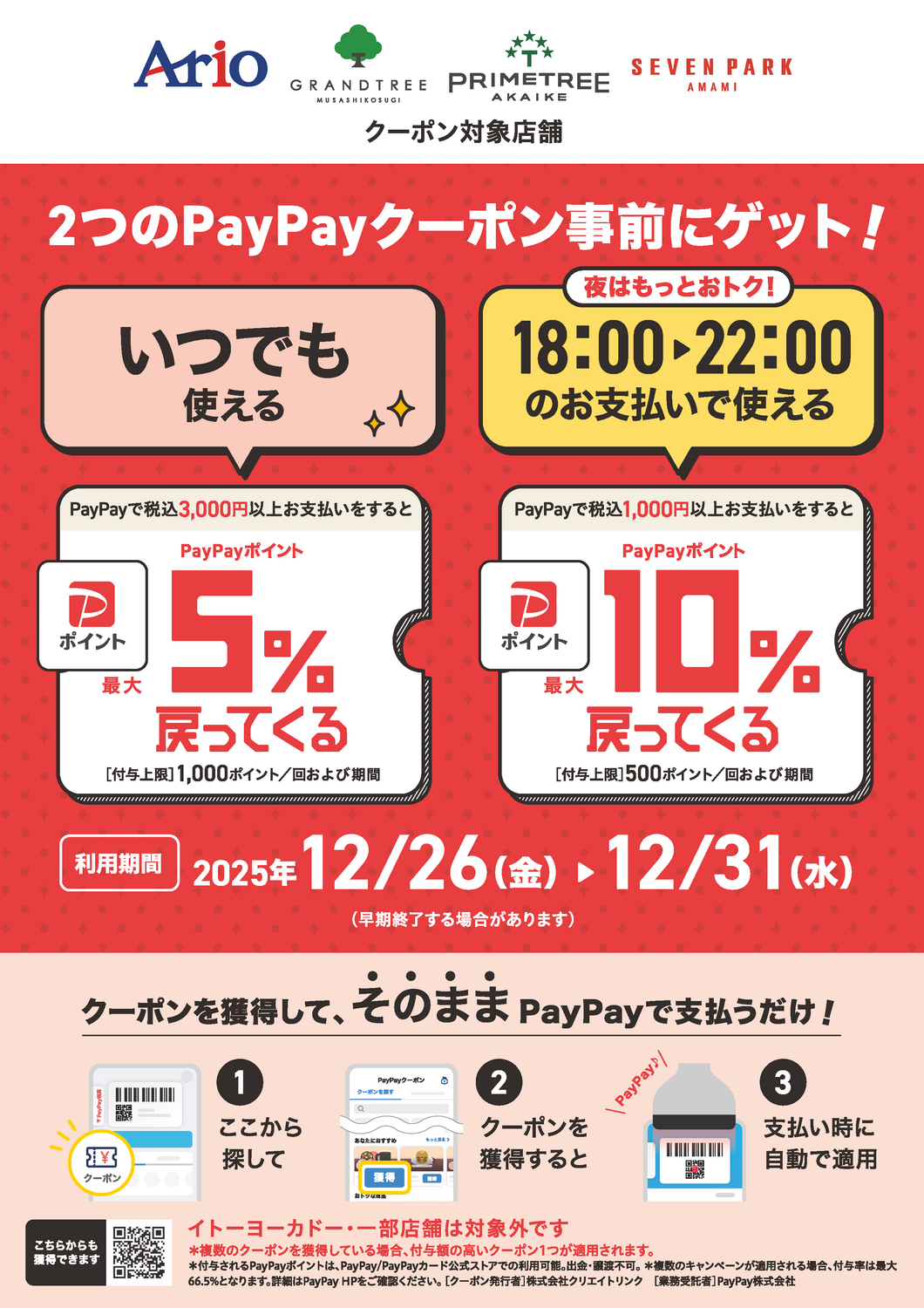 アリオ、グランツリー武蔵小杉、プライムツリー赤池、セブンパーク天美で「昼も夜もお得!」限定クーポン配布