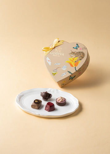 「不思議の国のアリス」の印象的なシーン「ティーパーティ」をイメージしたチョコレートを楽しめる、キュートな「アリスのティーパーティ コレクション」。 ティーパーティを彩る紅茶やカップケーキなどをイメージした限定チョコレートを、物語のシンボルのトランプやティーセット、いたずら好きなチェシャ猫を描いたハート形のパッケージに詰め合わせました。
