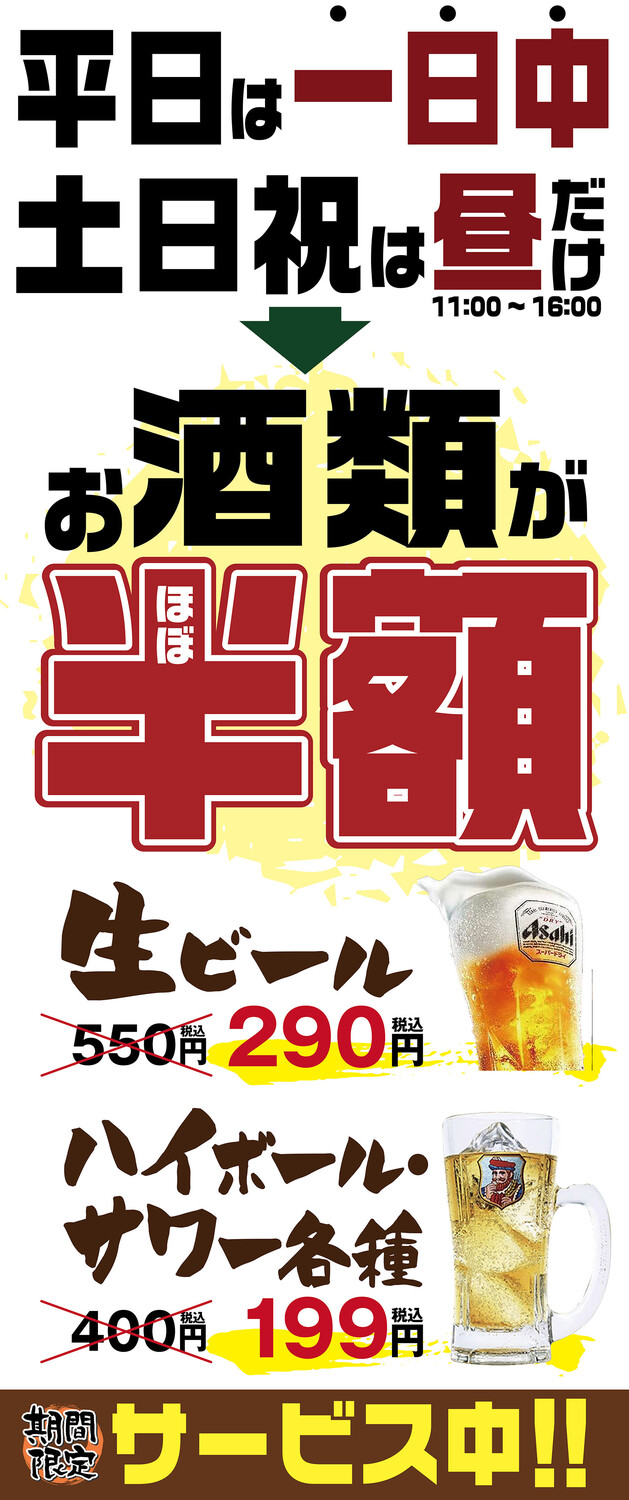 平日は1日中お酒が安くなります。