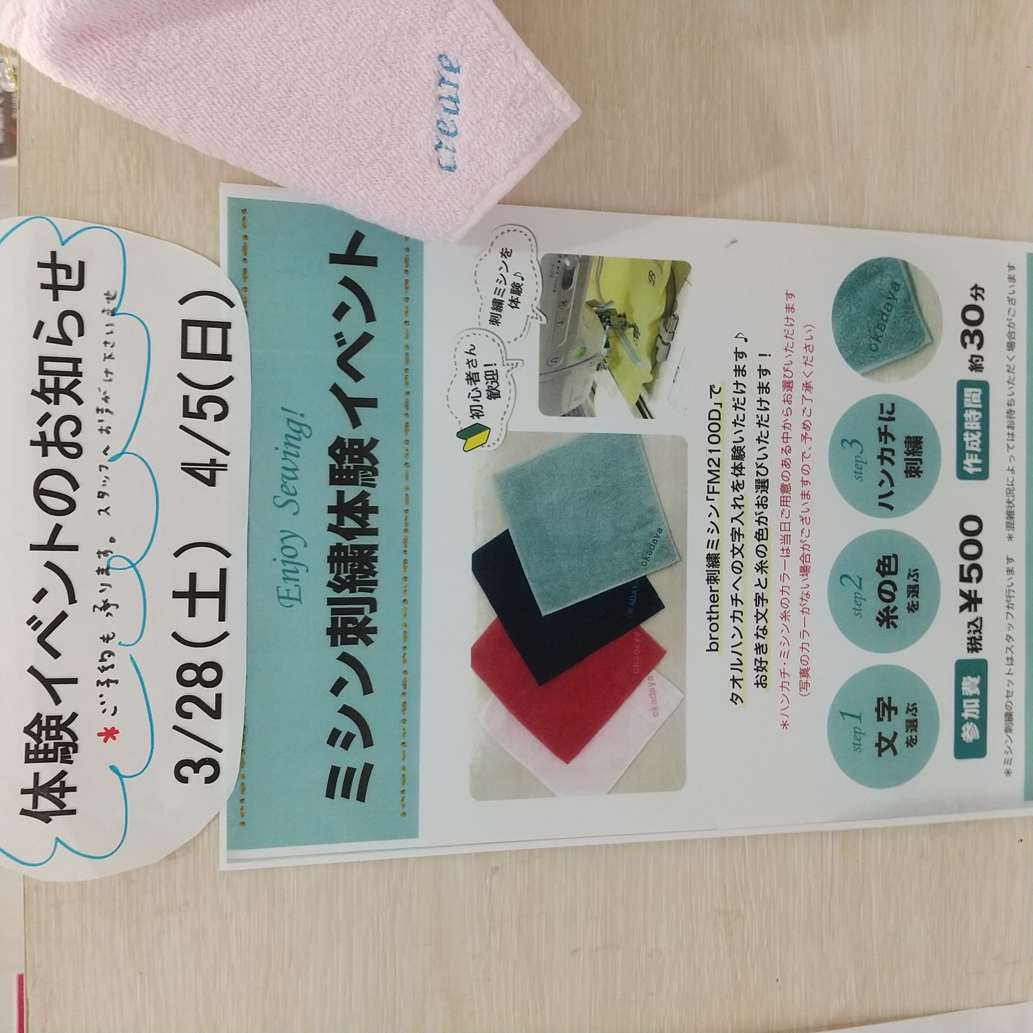 タオルハンカチに文字入れを体験していただけます